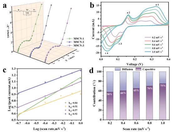(a) Electrochemical impedance spectra (EIS) of MSCN-x (x = 1, 2, 3) electrodes. (b) CV curves of MSCN-2 at different scanning speeds. (c) Plots of log (i) vs. log (v) for Peak1~Peak 4 of MSCN-2. (d) Capacitive contribution ratios at different scan rates of MSCN-2.