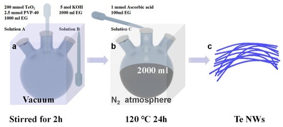 Tellurium (Te) belongs to the VI group of the chalcogen elements and exhibits a tunable bandgap ranging from 0.33 to 1.42 eV based on size and dimension scaling [1,2,3,4,5]. The single element aspect of Te, akin to silicon or carbon-based, suggests that high-quality materials can be grown for semiconductor devices [6,7,8]. While Te can be grown in different dimensions (e.g., nanoparticles, nanowires, nanosheets, etc.), 1-D Te nanowires (Te NWs) hold immense promise for high-performance electronics as they can maintain an accessible bandgap (<2 eV) when scaled down to the nano scale. In addition, ultralong Te NWs can function similarly to carbon nanotubes, thus making Te NWs with controlled dimensions, exceptional mobility, and energy efficiency among the key contenders for extending Moore’s Law [9,10]. However, for industrial applications, it is imperative to devise a technique for the large-scale synthesis and meticulous size regulation of Te NWs for semiconductor devices [11,12]. However, the synthesis of high-quality, size-controlled, uniform, and ultralong Te NWs remains a significant challenge [13]. To overcome this challenge, researchers have proposed various synthesis methods, including chemical vapor deposition (CVD) [14], physical vapor deposition (PVD) [15], microwave-assisted methods [16], the electrochemical deposition method [17], and the hydrothermal method [18,19]. Among these methods, the solution-based approach is widely regarded as the most promising for achieving size-controlled and uniform large-scale production of Te NWs [18]. Nanometers and lengths extending to several micrometers were studied by Furuta [20]. Meanwhile, Li [21] and colleagues successfully synthesized Te NWs with diameters ranging from 72 to 240 nm and lengths, making the bandgap rather small for room-temperature semiconductor applications. Another approach involved a one-pot hydrothermal method to synthesize uniform Te NWs with diameters ranging from 7 to 9 nm; however, the lengths were limited to several micrometers. In addition, this method had drawbacks, such as the unfriendly environment involving hydrazine hydrate and ammonia, along with potential safety concerns associated with high-temperature, high-pressure, large-scale synthesis that required thickened reaction vessels and Teflon linings [19]. Despite the variety of methods proposed for preparing tellurium nanostructures, traditional approaches have often struggled to meet the demand for environmentally friendly, large-scale production of ultralong Te NWs.