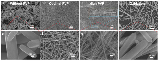 Effect of surface surfactant: (a) without surface surfactant, (b) with an optimal surface surfactant concentration, (c) with double the surface surfactant concentration, (d) in an oxygen-rich environment. (e), (f), (g) and (h) correspond to high-magnification SEM images of (a), (b), (c), and (d), respectively.