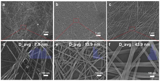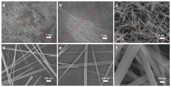 Next, we examined the impact of temperature on the growth of nanowires. At 90 °C, as shown in Figure 3a,d, the lower temperature leads to slower nanowire growth with an average diameter of 7.9 nm but the formation of a higher amount of tellurium nanospheres [22]. When the temperature is increased to 120 °C, as seen in Figure 3b,f, better NW growth, with an average diameter of 13.9 nm, and quality are observed, resulting in improved single-crystal growth and longer nanowires. This temperature is more favorable for NW growth compared to 90 °C, leading to an increased longitudinal growth rate and longer nanowires. However, when the temperature is further raised to 160 °C, it can lead to the formation of overgrowth of larger NWs with an average diameter of 43.9 nm. Figure 3 (d), (e), and (f) are magnified images based on Figure 3 (a), (b), and (c), respectively. Each image includes 50 nanowires used to calculate the average diameter. It can be observed that at lower temperatures, tellurium nanowires grow slowly, resulting in the formation of by-products and a sparser distribution. With increasing temperature, the growth rate increases, and a denser network of nanowires is formed. These results emphasize that the synthesis temperature is a critical parameter for controlling the size and morphology of tellurium nanowires. In addition to temperature, the growth time also has a significant impact on the morphology of tellurium nanowires.
