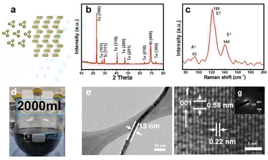 Figure 5a depicts a visual lattice diagram of Te nanowires in z and y directions. In Figure 5b, the XRD spectrum of Te NWs synthesized on a large scale is displayed. The distinct diffraction peaks observed at 23.04°, 27.56°, 40.45°, and 47.05° are identified as corresponding to the (100), (101), (102), and (200) crystal planes of Te NWs, respectively. These observations are in accordance with the JCPDS file No. 36-1452. This confirms the successful synthesis of pure Te NWs with (001) preferred growth direction high crystalline. The Raman spectrum of Te NWs is shown in Figure 5b. The peaks at 93 cm−1, 120 cm−1, and 140 cm−1 correspond to the chain extension mode, bond bending, and bond stretching modes [1,23], respectively. These peaks are consistent with previous reports [24]. Figure 5d exhibits a magnified photograph of the reaction involving a 2000 mL solution of Te NWs. Figure 5e displays TEM images of the Te NW a diameter of approximately 13 nm. Additional analysis revealed that the synthesized nanowires had an average diameter of 13.9 nm with a standard deviation of 1.1 nm (n = 50), as shown in Figure 3e. The synthesized product is linear and well-formed. Figure 5f shows a TEM image of the Te NWs, displaying uniformly spaced lattice fringes, indicating excellent crystallinity. The distance between adjacent lattice fringes is approximately 0.58 and 0.22 nm, consistent with the (001) and (110) crystal planes of Te (JCPDS No. 36-1452). This, combined with the electron diffraction pattern of a single Te NW in Figure 5f, demonstrates that the Te NWs grow along the (001) direction, further confirming the preparation of perfect single-crystalline NWs that grow along the (001) direction. PVP plays a crucial role in promoting the non-helical chain-like structure of Te NWs [25], resulting in highly crystalline growth patterns, which are key factors in improving electron transport performance.