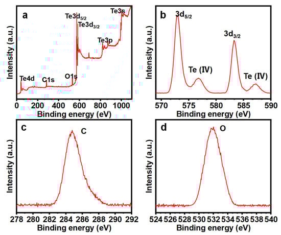 The high-resolution X-ray Photoelectron Spectroscopy (XPS) core-level spectra, (a) full spectrum, (b) Te-spectrum, (c) C-spectrum, and (d) O-spectrum.