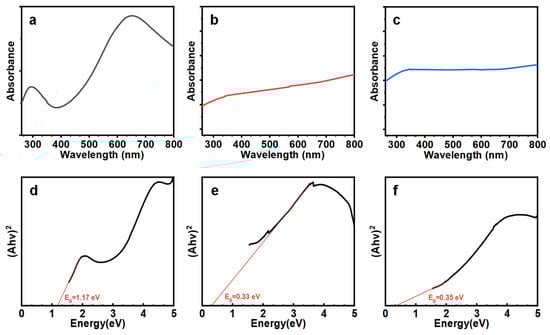 UV-vis spectrum of Te nanowires (a) Te NWs grown at 120 °C for 24 h under nitrogen protection, (b) Te nanostructure grown without PVP, and (c) Te nanostructure grown in an oxygen-containing environment. (d), (e), and (f) are the Tauc plots used to estimate the optical bandgap for (a), (b), and (c), respectively.