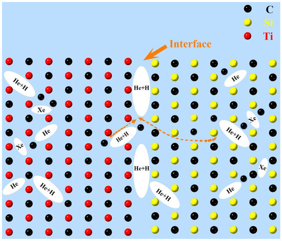 On the other hand, as Xe atoms have a large atomic radius and a high migration energy barrier, most of them were pinned in the SiC/TiC grains and grain boundaries. Therefore, no cavities or Xe bubbles were observed at the interface region in the single Xe ion-irradiated sample. With subsequent high-dose helium ion irradiation, helium bubbles prefer to nucleate at the interface region to form large bubbles [37]. Compared with the bubbles in the Xe + He ion-irradiated SiC fibers, there is a significant increase in the bubble density after the implantation of H ions, as illustrated in Figure 5b,c. The diffusion coefficient dependence on temperature is generally expressed as follows [38]: , where D0 is the constant; QA represents the activation energy for diffusion, which is positively correlated with atomic size; and k and T are the Boltzmann constant and temperature, respectively. Therefore, the increased bubble density following the implantation of H ions is related to the higher diffusion coefficient of H compared to those of He and Xe. Our previous study [39] illustrates that the implanted H ions have a fast migration rate inside the lattice and can attach to He bubbles to accelerate the migration of He bubbles to the interface; in addition, helium bubbles nucleate and grow more readily because H ions can reduce their surface energy [40]. The nucleation of bubbles is affected by the combination of volume free energy and surface energy, which can be described by the following equation [41]: , where is the total free energy change; represents the free energy per unit volume, which becomes negative during nucleation; r represents the radius of an embryo, and when the embryo radius is larger than the critical nucleus radius r*, nucleation is triggered; and γ represents the specific surface energy, serving as a retardation force with a surface energy of . Due to the reduction in surface energy induced by implanted H ions, the critical nucleus radius r* of the bubbles decreased in the sample irradiated with Xe + He + H ions, which means that the nucleation and growth of helium bubbles become easier. Thus, the average size of bubbles in the interface region under Xe + He + H ion irradiation is larger than that in samples irradiated with only Xe + He or Xe ions. Figure 6 presents a schematic of bubble aggregation and migration in the interface region of the sample irradiated with Xe + He + H ions. Hydrogen bubbles are formed by the reaction between incident H ions and electrons from the sample [42,43], as represented by the following chemical reaction formula: H2 = 2H+ + 2e−.