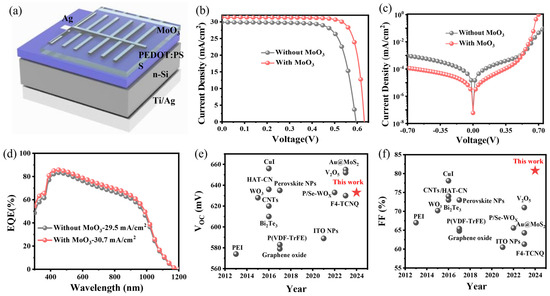 (a) Device configuration of PEDOT:PSS/Si solar cells with a MoO3 capping layer. (b) J–V curves of PEDOT:PSS/Si solar cells without and with the MoO3 layer under simulated AM 1.5 illumination at 100 mW cm−2. (c) Corresponding dark J−V and (d) EQE curves of PEDOT:PSS/Si solar cells. The historical (e) VOC and (f) FF of high-performance planar Si/PEDOT:PSS solar cells with a modified front interface layer are juxtaposed for comparison.