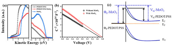 To elucidate the effect of the MoO3 layer on the interface of PEDOT:PSS/Si heterojunction, the electronic structures of PEDOT:PSS, PEDOT:PSS/MoO3, and MoO3 are determined through UPS measurements (Figure 3a). The work functions of pristine PEDOT:PSS and MoO3 films are 4.8 and 5.4 eV, respectively. When MoO3 is deposited on PEDOT:PSS thin films, the work function of PEDOT:PSS increases by 0.2 eV. The enhanced work function of the PEDOT:PSS film may induce stronger inversion effects, leading to higher Vbi in the Si/PEDOT:PSS heterojunction. The Vbi of the corresponding device can be fitted from the 1/C2-V curve (Figure 3b) and extracted by means of Equation (3).