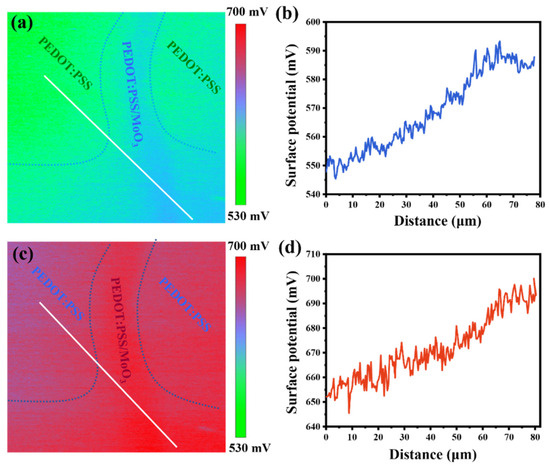 Surface potential image of MoO3 film partially covering the surface of PEDOT:PSS (a) without and (c) with solar irradiation. Both of the scale bars are 10 µm. Cross-sectional line profile of the surface potential image (b) without and (d) with solar irradiation.