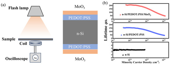 The introduction of the MoO3 interface layer also provides excellent field-effect passivation at the n-Si/PEDOT:PSS interface, effectively suppressing carrier recombination at the heterojunction interface. To investigate the impact of MoO3 on surface recombination at the PEDOT:PSS/Si heterojunction, minority carrier lifetime (τeff) tests were performed on the relevant sample surfaces using quasi-steady-state photoconductivity (QSSPC) technology (Figure 5a). Figure 5b shows the τeff versus the excess carrier density (Δn) for n-Si substrates passivated by PEDOT:PSS and PEDOT:PSS/MoO3 films. The τeff of an n-type silicon wafer is 3 µs at an injection level of 1014 cm−3. Under the same Δn conditions, the τeff of Si/PEDOT:PSS and Si/PEDOT:PSS/MoO3 samples reaches 157 and 209 µs, respectively. This result indicates that the introduction of a MoO3 layer significantly increases the τeff of the photovoltaic device. There is a close relationship between minority carrier lifetime and surface recombination rate, as shown in Equation (4).