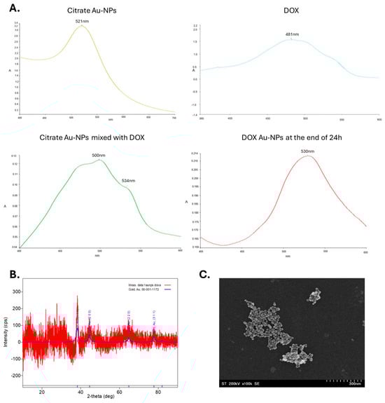 (A) UV-Vis spectra of citrate Au-NPs, DOX, citrate Au-NPs mixed with DOX at T0, and DOX Au-NPs after 24 h; (B) XRD spectrum of DOX Au-NPs; (C) TEM image of DOX Au-NPs.