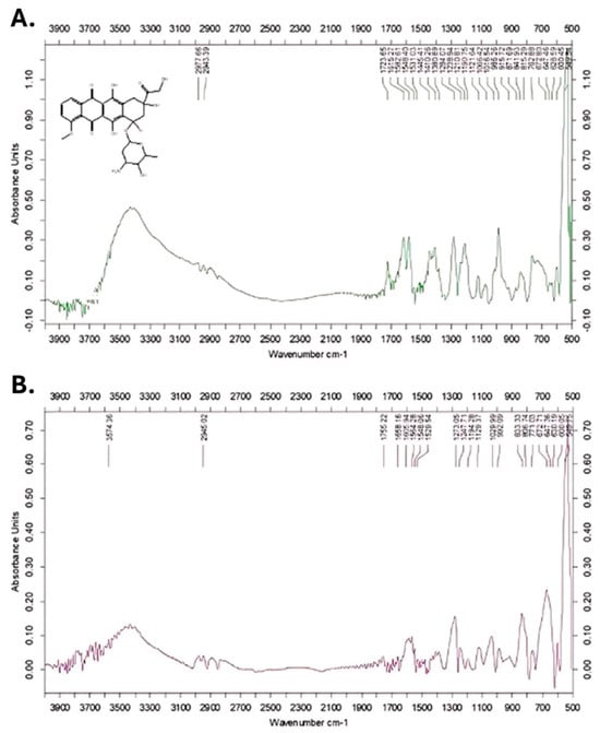 An FTIR analysis was conducted to identify and confirm the presence of DOX on the surface of the metal nanoparticles. The FTIR spectrum of DOX (Figure 3A) displayed a broad absorption band between 3200 and 3600 cm−1, characteristic of the OH group vibrations in DOX. The peak at around 1723 cm−1 corresponds to the vibration of the C=O bond in the anthracycline structure from DOX. In the FTIR spectrum of the DOX Au-NPs (Figure 3B), similar absorption bands were observed, as follows: a broad peak at 3574 cm−1 corresponding to OH group vibrations; a band at 2945 cm−1, attributed to the stretching vibration of the C-H bond; and a peak at 1755 cm−1, indicating the presence of the C=O bond in the biomolecules located on the surface of the metal nanoparticles. These absorption bands confirm the presence of DOX molecules on the surface of synthesized metallic nanoparticles.