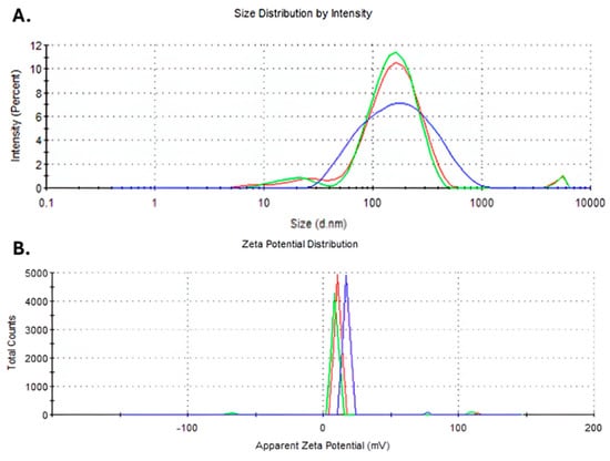 (A) Hydrodynamic diameter; (B) zeta potential. Blue, red and green lines represent three different replicates.