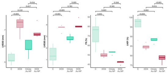We sought to evaluate whether the molecular and ultrastructural changes seen in animals treated with DOX Au-NPs resulted in anatomical and functional damage, as measured by cardiac ultrasound. Both the left ventricular end-diastolic diameter and left ventricular end-systolic dimension were significantly larger in the DOX-treated animals (p < 0.001 for both groups). Similarly, DOX Au-NPs exerted a detrimental effect on cardiac tissue, with both left ventricular end-diastolic diameter and left ventricular end-systolic dimension being significantly increased vs. the citrate Au-NP control (p = 0.016 and p = 0.005, respectively). When comparing the DOX Au-NP-treated animals with those receiving standard DOX, no differences were seen in these parameters. Moreover, this effect was also seen in the case of citrate Au-NPs, with the enlargement of the left ventricular end-systolic dimension reaching statistical significance (p < 0.001). As far as the cardiac function expressed through the ejection fraction is concerned, a significant decrease was seen in the groups receiving DOX and DOX Au-NPs (p < 0.001 for both). Moreover, in the DOX Au-NP group, the ejection fraction values were significantly lower than those seen in the DOX group (p = 0.011) (Figure 5).