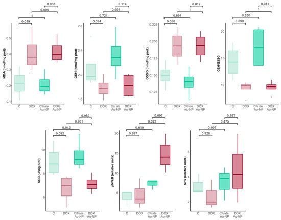 As far as the effect of DOX Au-NPs on cardiac oxidative stress, the results show significant alterations in multiple of the analyzed parameters. Namely, MDA was significantly increased with respect to the citrate Au-NP control (p = 0.033), a level similar to that seen in DOX-treated rats (p = 0.999). GSSG and the resulting GSH/GSSG ratio were also significantly affected (p = 0.017 and p = 0.013, respectively) (Figure 6). SOD levels were also depleted in the DOX Au-NP-treated animals, but with a p-value at the limit of significance (p = 0.053). Gold nanoparticles prepared with citrate diminished the lipid peroxidation and increased GSH levels and the GSH/GSSG ratios, as well as improved SOD activity. Regarding the signaling pathways related to the oxidative stress response and inflammation, the pNFkB and Nrf2 levels were analyzed in the four study groups. While a degree of alteration was seen both in the DOX and DOX Au-NP-treated rats, only the pNFkB levels differed significantly among the analyzed groups. Namely, the DOX Au-NP animals showed increased levels of pNFkB with respect to the DOX treatment (p = 0.022). Moreover, these levels also tendentially increased in the DOX Au-NP animals with respect to the citrate Au-NP controls (p = 0.097) (Figure 6).