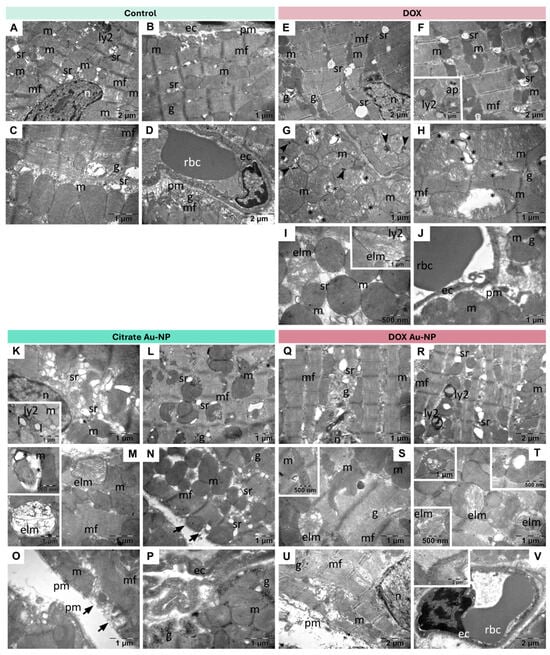 Representative TEM images of cardiac tissues from the four study groups. (A–D) Control: normal ultrastructural aspect of the myocardium samples from the control group. (E–J) DOX: extensive ultrastructural alterations of mitochondria and sarcoplasmic reticulum in the myocardium samples from the DOX group; asterisk: mitochondrial whorls of membranes. (K–P) Citrate Au-NP: diverse ultrastructural alterations in the myocardium samples from the citrate Au-NP group. arrow: disrupted plasma membrane; arrowhead: abnormal mitochondrial cristae with multiple membranes; asterisk: mitochondrial whorls of membranes; (Q–V) DOX Au-NP: limited ultrastructural alterations of mitochondria and sarcoplasmic reticulum in the myocardium samples from the DOX Au-NP group. ec: endothelial cell; g: glycogen; ly2: secondary lysosome; m: mitochondria; mf: myofibrils; n: nucleus; pm: plasma membrane; rbc: red blood cell; sr: sarcoplasmic reticulum; ap: autophagosome; arrowhead: abnormal mitochondrial cristae with multiple membranes; elm: electron lucent mitochondrion; ly2: secondary lysosome; l: lipid droplet.