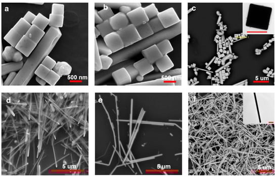 SEM images (a–c) silver nanocubes (d–f) silver nanowires SEM images (a–c) silver nanocubes (d–f) silver nanowires (the inset shows the TEM micrograph of corresponding nanocube and nanowire with a scale bar of 500 nm) [57]. Copyright © 2020, Springer.