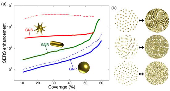 Density dependence of the SERS performance in nanoparticle monolayers. The particle coverage is defined as the fraction of area occupied by the projection of the metal along the normal plane (solid curves and dashed curves represent different incident wavelengths) [59] (a,b). Copyright © 2016, American Chemical Society.