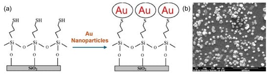 Nanoparticle suspensions are dynamic systems that are pretty unstable and prone to aggregate to different degrees over time. When nanoparticle suspensions are used as SERS substrates, the stability and reproducibility of the SERS signal are very low, which severely limits its applications. To address the instability of the suspension SERS substrate, as well as to simultaneously utilize the aggregation of nanoparticles to further enhance the SERS effect, an effective approach is to immobilize the nanoparticles on some solid substrate. For example, the method of chemically immobilizing nanoparticles on the surface of a solid substrate is known as the “chemical tethering” method [60]. As shown in Figure 3, the surface of a silicon wafer is silanized with (3-mercaptopropyl) trimethoxysilane to attach a chemical chain with a sulfhydryl group at the end. When the treated wafer is immersed in a suspension of silver and gold nanoparticles prepared with sodium triacetate, the sulfhydryl groups will attach to the surface of the wafer, tethering the nanoparticles to the surface of the wafer. It can be observed that the nanoparticles are uniformly and densely distributed on the wafer surface [61].