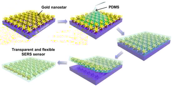 Schematic illustration showing the fabrication process of a flexible SERS sensor with gold nanostar arrays. Self-assembled gold nanostar arrays are transferred from silicon substrate into polydimethylsiloxane (PDMS) [63]. Copyright © 2017, Royal Society of Chemistry.