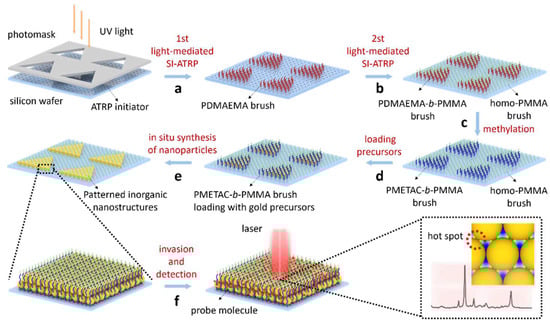 Large-area arrays of plasma clusters arranged in an orderly fashion were prepared using square arrays of PDMS containing submicron porous dimensions as templates [90,91,92]. The porous size of the PDMS molds determines the diameter and lattice parameters of the gold nanostructures, while the gold nanoparticle colloidal concentration determines the number of layers and the self-assembly quality of the plasma clusters. In addition, the correlation of plasmon resonance and the corresponding SERS effect between gold nanoparticle clusters prepared with different porous sizes of molds were investigated. Significant differences in the SERS effect of the plasma clusters with different geometries were found. In another study, a robust strategy to generate tailor-made and efficient SERS platforms by using patterned amphiphilic block copolymer brushes for assembling Au nanoparticles into highly uniformly distributed and densely packed plasmonic nanoparticles was developed (Figure 8) [93]. To achieve this, patterned polymethacryloyloxyethyl trimethylammonium chloride-block-polymethyl methacrylate brushes are grown on a substrate using the light-mediated surface-initiated atom transfer radical polymerization technique assisted by photomasks. The inner hydrophilic domains are utilized as nanoreactors for the formation of Au nanoparticle assemblies, while the outer polymethyl methacrylate blocks serve as confinement. Following the polymer brushes template-assisted in situ nucleation and growth approach, patterned quasi-two-dimensional (2D) Au nanostructures with controllable size and shape can be feasibly fabricated under ambient conditions.