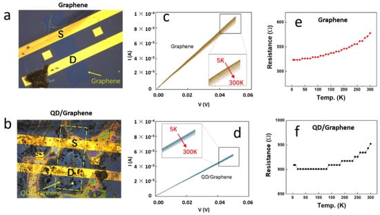 I–V curves of the graphene device and the QD/graphene heterostructure device at various temperatures. (a) Optical microscope image of the graphene device. The letter “S” represents the source electrode and the letter “D” represents the drain electrode. (b) Optical microscope image of the QD/graphene heterostructure device. (c) I–V curves of the graphene device at different temperatures. (d) I–V curves of the QD/graphene heterostructure device at different temperatures. (e) Temperature dependence of the resistance for the graphene device. (f) Temperature dependence of the resistance for the QD/graphene heterostructure device.