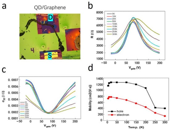 Figure 4a displays the configuration of the measured device, with the source (S) and drain (D) electrodes indicated. Figure 4b,c show the relationship between the resistance and gate voltage as well as the dependence of two-dimensional conductivity on gate voltage, respectively, for the QD/graphene heterostructure device at various temperatures. The gate voltage Vg can modulate the carrier concentration in graphene, and there is a linear relationship between the carrier concentration and the gate voltage, which is expressed as follows: