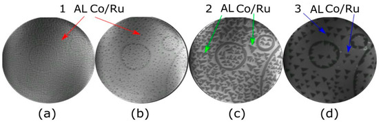 In agreement with our prior works [21,24], we find that only 2 AL-thick areas are magnetized in the out-of-plane direction, whereas other thicknesses (i.e., 1, 3, 4 and 5 AL) present an in-plane magnetization [21,22]. Figure 2a,b show LEEM and SPLEEM (with the magnetic sensitivity in the out-of-plane direction) images, respectively, of 2–3 AL films of Co. In Figure 2b, 2 AL-thick areas are the only ones that present black or white domains, corresponding to domains where the magnetization locally points out of the film (black) or into the film (white). The 3 AL-thick areas of the film do not show magnetic contrast out-of-plane. The last SPLEEM image (Figure 2c) shows the local magnetization along the in-plane direction. Now, the 2 AL areas have a zero magnetic contrast component in-plane, while the 3 AL areas display non-zero magnetic contrast.
