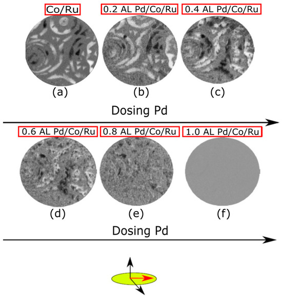 In addition to the LEEM real space images, SPLEEM images were acquired simultaneously during Pd deposition on the 2 + 3 AL Co film. Figure 4a displays the SPLEEM image with an in-plane spin-polarized electron beam corresponding to the same area shown in Figure 3a. The image shows magnetic contrast only in the 3 AL areas of the Co film, as explained before. As Pd is deposited (Figure 4c–f), the magnetic in-plane contrast of the 3 AL Co islands progressively disappears until no in-plane magnetic contrast is observed at the completion of a single Pd capping layer (Figure 4f). After the Pd deposition, the sample was cooled down to RT, and similar SPLEEM images were acquired with no contrast. Conversely, when the SPLEEM polarization was set out-of-plane (Figure 5b), both the 2 AL and the 3 AL Co areas presented out-of-plane magnetization, confirming that the deposition of a single monolayer of Pd switches the magnetization easy-axis of the 3 AL thick Co islands from in-plane to out-of-plane, while no change is observed in the easy-axis of the 2 AL areas.