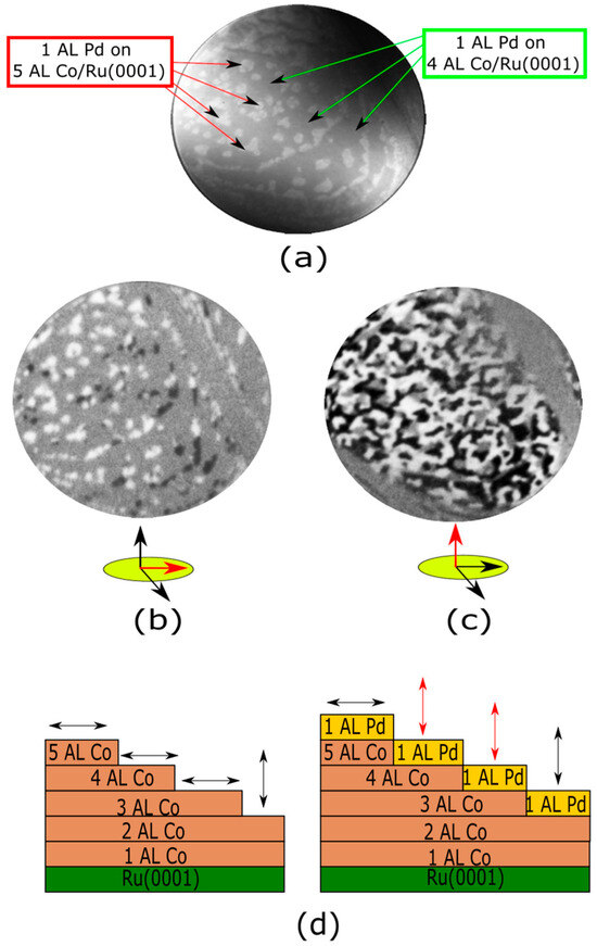 Figure 6d presents a graphical summary of our thickness-dependent SPLEEM observations before and after capping with palladium. Cobalt films exhibit out-of-plane anisotropy only up to 2 AL, falling in-plane for thicker layers (left panel). Capping with a Pd monolayer switches the magnetization easy axis from in-plane to out-of-plane (thus overcoming shape anisotropy) in the Co regions 3 and 4 AL thick. In other words, Pd capping “delays” the thickness-dependent transition from out-of-plane to in-plane anisotropy from 3 to 5 AL of cobalt.
