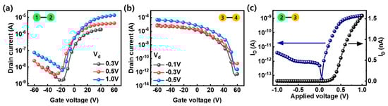 Figure 1b shows an optical microscope image of the fabricated device. This device has electrode patterns to verify the electrical characteristics of the WSe2 channel. The electrodes marked 1–2, 2–3, and 3–4 shown in the optical image are used as indicators to verify the electrical characteristics of n-type WSe2, p–n homojunction of WSe2, and p-type WSe2, respectively. The inset in Figure 1b shows the thickness of the transferred WSe2 measured with an Atomic Force Microscope (AFM). The measurement location is indicated by the red line in Figure 1b. The thickness of WSe2 was 10.3 nm. Figure 1c shows the Raman spectrum of the WSe2 flake obtained by 514 nm excitation measured after the transfer. In the frequency range of 200–450 cm−1, three Raman peaks (, , ) characterizing WSe2 are located at 247.8, 256.4, and 307.6 cm−1, respectively, and the other small peaks observed in the 350–400 cm−1 range are the peaks from thick WSe2, related to second-order and combination Raman modes [42,43]. Figure 2 shows the electrical characteristics of the device with a channel between the electrodes indicated by numbers in the optical image in Figure 1b. Figure 2a shows the Id–Vg curves of transferred pristine WSe2 measured at Vd = 0.3, 0.5, and 1.0 V. The pristine WSe2 FET behaved like a depletion-mode nFET with an electron current of 13 μA at VG = + 60 V, Vd = 1.0 V. These are the typical characteristics of thick WSe2 above ~5 nm [44]. The plasma-treated WSe2 channel and Pd electrodes marked 3 and 4 show a p-type behavior where the current changes from 10−12 A to 10−5 A in the gate range from 60 V to −60 V, as shown in Figure 2b. The polarity conversion from n-type to p-type behavior after the plasma treatment process was successfully confirmed even though both devices operate in depletion mode. As shown in Figure 2c, the output curve of the device formed between the electrodes marked 2 and 3 behaves like a forward-rectifying diode and exhibits 1.6 nA at forward bias (Vd = 1.0 V), about 400 times higher than at reverse bias (Vd = −1.0 V), confirming the successful formation of a p–n homojunction in WSe2.