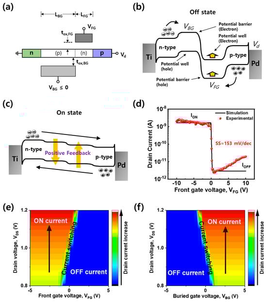 A cross-sectional schematic of the WSe2 FBFET is shown in Figure 3a. When a forward bias is applied to the drain (Pd electrode), the forward current of the p–n junction flows from drain to source. In the off state of the FBFET, a buried gate bias (VBG) and a front gate bias (VFG) modulate the WSe2 channels to p-type and n-type, respectively. These gate voltages form the potential barriers and wells of holes and electrons that turn off the FBFET in the ideal band diagram, as shown in Figure 3b. When VFG sweeps from the voltage forming the potential barrier to the opposite polarity (in this case, from 10 V to −10 V), the potential barrier for hole injection from drain to channel is lowered, and some of the holes are injected and accumulate in the potential well for hole. As holes are accumulated in the potential well, the potential barrier for electrons is lowered. As a result, electrons are injected into the channel from the source and accumulate in the electron potential well, further lowering the potential barrier for holes. When VFG lowers the potential barrier enough to enter the feedback loop, this cycle occurs quickly and spontaneously, causing dramatic barrier modulation and switching to the on state, as shown in Figure 3c. Figure 3d shows the Id–VFG curve measured from the WSe2 FBFET at Vd = 1.0 V, VBG = 0 V. The on/off ratio is ~103. The minimum SS value is 153 mV/dec. Even though this value is higher than the lower limit of silicon MOSFET ~60 mV/dec, an abrupt current increase due to the feedback mechanism at the homojunction is successfully demonstrated, even in the 2D material channel. The simulation confirmed that abrupt current switching behavior follows the feedback mechanism. Since the current switching point is affected by the barrier structure, it can vary depending on Vd and VBG. The fitting did not work for the negative-bias region because the high leakage current at the negative-bias region due to band-to-band tunneling was not included in the modeling. A simulated correlation map between the front gate bias and the drain bias is shown in Figure 3e. Vd determines the initial number of carriers that cannot cross the barrier formed by the front gate bias. At a high Vd, the drain current increases, and the number of carriers crossing the barrier increases, making it easier to enter the feedback mechanism. Therefore, when Vd is larger than 1.0 V, current switching can occur at VFG > 0 V. Figure 3f shows the simulated correlation map between the buried gate bias and the drain bias. When Vbg sweeps (in this case from −5 V to 5 V), the potential barrier for electrons controls the carriers, so electrons become the majority carriers. The device can be operated as an n-type feedback FET.