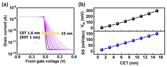 (a) Id–VFG characteristics, (b) threshold voltage (Vth), and subthreshold swing (SS) values for WSe2 FBFET when the capacitance equivalent thickness (CET) of the front gate dielectric is reduced from 15 to 1.6 nm.