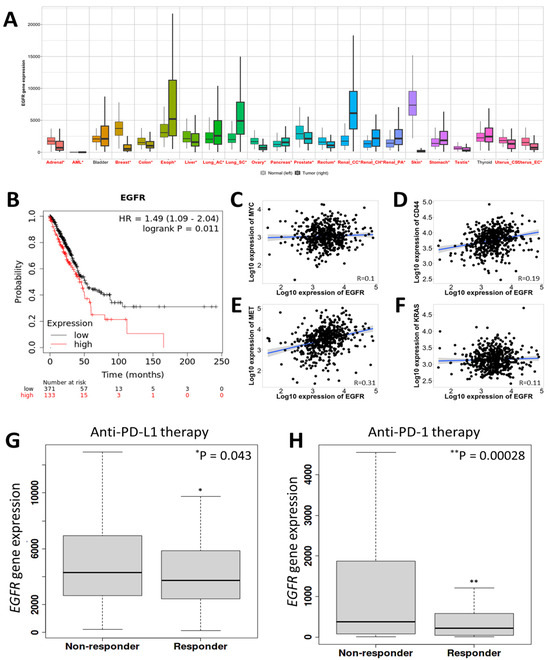 Programmed death-ligand 1 (PD-L1) and programmed death-1 (PD-1) are two proteins that play a key role in lung cancer immune evasion. PD-L1 is expressed on the surface of cancer cells and other cells in the TME. PD-1 is expressed on the surface of T cells, which are a type of white blood cell that plays a key role in the immune response. When PD-L1 interacts with PD-1, it sends a signal to the T cell to stop it from attacking the cancer cell. This allows the cancer cell to evade the immune system and continue to grow and spread. PD-L1 overexpression is common in lung cancer, and it is associated with a poor prognosis. Patients with PD-L1-overexpressing tumors are more likely to have shorter overall survival and are less likely to respond to immunotherapy [64]. Immunotherapy is a type of cancer treatment that harnesses the body’s immune system to fight cancer. Immune checkpoint inhibitors are a type of immunotherapy that blocks the interaction between PD-L1 and PD-1. This allows T cells to recognize and attack cancer cells [65]. Immune checkpoint inhibitors are effective in treating some patients with lung cancer, especially those with PD-L1-overexpressing tumors. Targeting the PD-L1/PD-1 pathway with immunotherapy is a promising approach to cancer treatment [64,65]. Therefore, we further analyzed the effect of anti-PD-L1 or anti-PD-1 therapy on the EGFR via bioinformatics analysis using the TCGA dataset. Interestingly, the expression of EGFR was significantly reduced in the responder group toward both anti-PD-L1 and anti-PD-1 therapy (Figure 1G,H). We conclude that EGFR is a crucial target for developing targeted therapeutics for cancers including lung cancer.