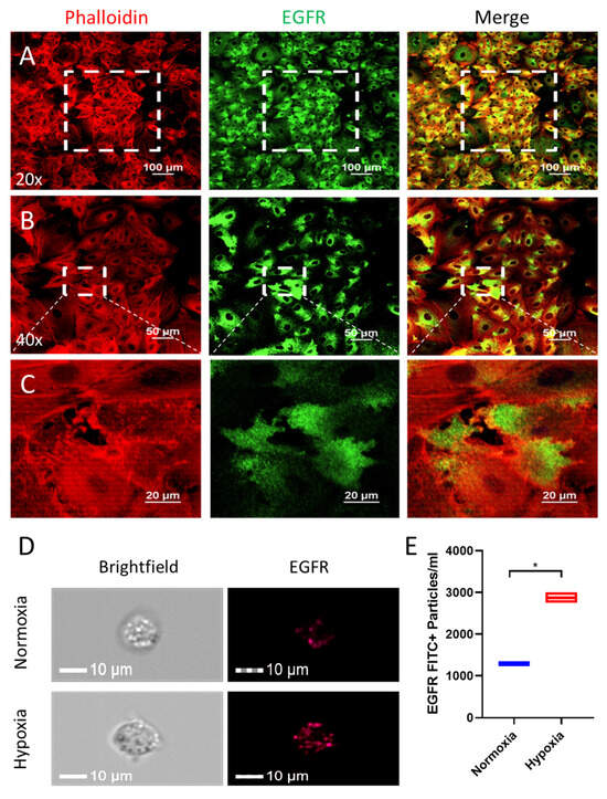 Enhanced expression of EGFR on lung cancer cells under hypoxia. Immunofluorescence microscopy showing the expression and distribution pattern of EGFR protein (green color) in A549 lung cancer cells at (A,B) 20× and 40× magnifications and (C) the corresponding enlarged images. (D,E) Image flow cytometry-based expression of EGFR on the A549 cells under normal and hypoxic conditions (24 h incubation) and the corresponding quantitative bar graph. Comparison between the normoxia and hypoxia groups was performed using the student’s t-test with a significance level of * p < 0.01.
