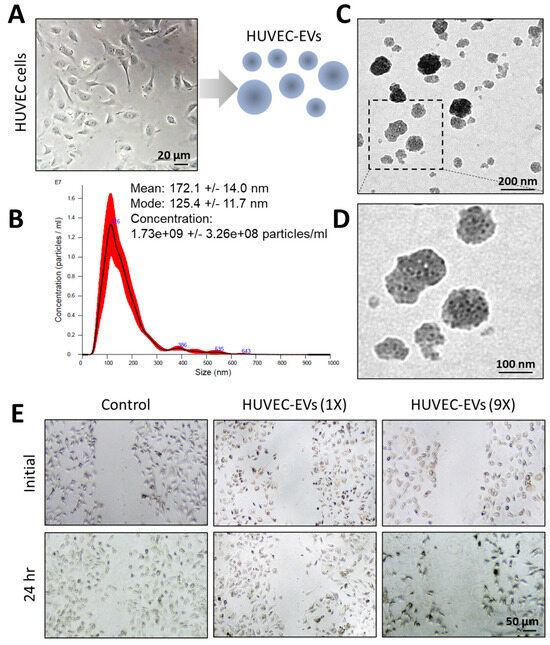 Isolation and characterization of EVs from endothelial cells: (A) representative bright-field image of HUVECs that had been cultured in EV-depleted medium for 24 h, before the isolation of EVs. (B–D) Representative (B) size distribution plot of the HUVEC-EVs; (C,D) immunogold dots showing the expression of CD63 on the HUVEC-EVs. (E) Representative brightfield images showing the migration of A549 cells at the start and 24 h. after the addition of HUVEC-EVs at different dilutions (1× and 9× with x = 1.73 × 109 particles/mL). Scale bars = (A), 20 nm; (C,D), 100 nm; (E), 50 nm.