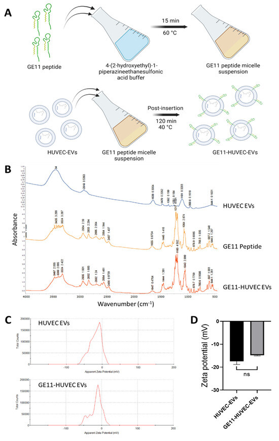 Characterization of engineered EVs with GE11 peptide via postinsertion technique: (A) a schematic showing the functionalization of HUVEC-EVs with the postinsertion of GE11 peptide; (B) representative FT-IR graphs with peaks characteristic for HUVEC-EVs, GE11 peptide, and GE11-HUVEC-EVs; (C,D) zeta potential graphs and the corresponding quantitative bar graph for the EVs before and after postinsertion of the GE11 peptide. Data are shown as the mean ± S.E.M. (N = 2). The statistical analysis was performed using the Student’s t-test for the control HUVEC-EVs vs. GE11-HUVEC-EVs. Significance levels set at * p < 0.05 and ** p < 0.01; ns = not significant.