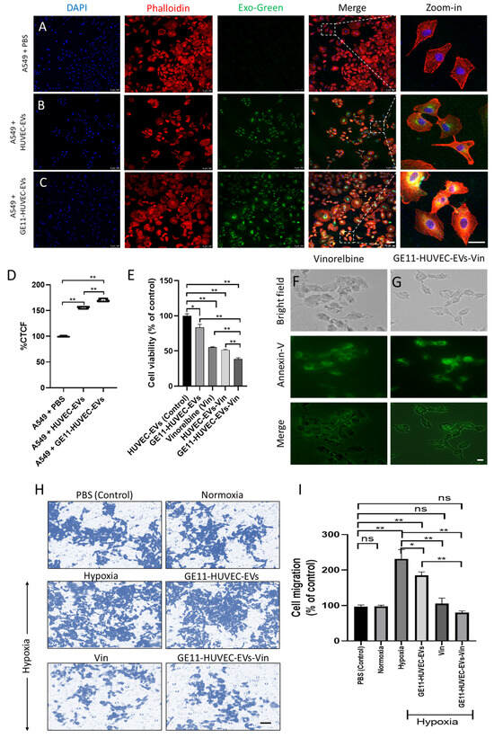 Effect of GE11-HUVEC-EVs-Vin on malignant phenotypes of A549 lung cancer cells. (A–D) GE11-peptide-engineered endothelial cell EVs are efficiently internalized by lung cancer cells. Representative (A–C) immunofluorescence images and (D) a violin plot showing the uptake of (A) PBS, (B) HUVEC-EVs, and (C) GE11-HUVEC-EVs by the A549 cells (scale bar = 100 nm). (E) GE11-HUVEC-EVs-Vin significantly reduced the cell viability of A549 cells. Representative bar graph showing the effect of the following different treatment groups—HUVEC-EVs, GE11-HUVEC-EVs, vinorelbine (Vin), HUVEC-EVs-Vin, and GE11-HUVEC-EVs-Vino—on the proliferation of A549 cells, as detected by the MTT cell viability assay. (F,G) Representative immunofluorescence images showing the expression of Annexin-V in A549 cells treated with Vin or HUVEC-EVs-Vin (scale bar = 100 nm). (H,I) GE11-HUVEC-EVs significantly reduced the migration of A549 cells under hypoxia. (H) Representative images from the Transwell chamber (scale bar = 100 nm) and (I) a bar graph showing the effects of the following different treatment groups—HUVEC-EVs, GE11-HUVEC-EVs, Vinorelbine, HUVEC-EVs-Vin, and GE11-HUVEC-EVs-Vino—on the migration ability of A549 cells, as detected by the Transwell migration assay under hypoxia, compared to the vehicle-treated and untreated normoxia. Data are shown as the means ± standard error means (S.E.M.), with N = 3 replicates per group. Significance levels set at * p < 0.05 and ** p < 0.01; ns = not significant. Statistical comparisons were performed for the control vs. HUVEC-EVs; control vs. GE11-HUVEC-EVs; control vs. vinorelbine; control vs. HUVEC-EVs-Vin; and control vs. GE11-HUVEC-EVs-Vin with one-way ANOVA. For comparison of the HUVEC-EVs or GE11-HUVEC-EVs or vinorelbine or HUVEC-EVs-Vin with GE11-HUVEC-EVs-Vin, the Student’s t-test was applied.