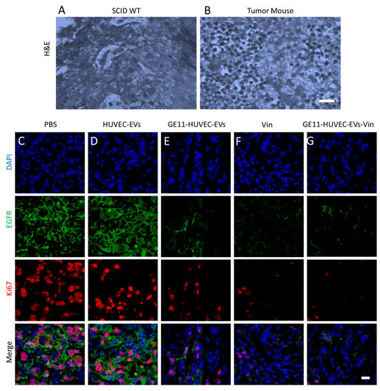 GE11-HUVEC-EVs-Vin significantly reduced the expression of EGFR and Ki67 in the tumor tissue of a mouse model of lung cancer: (A,B) representative H&E staining of the lung tissue of SCID WT and lung-cancer-cell-based tumor mouse model (scale bar = 50 µm); (C–G) representative immunofluorescence images showing the effects of different treatments—HUVEC-EVs, GE11-HUVEC-EVs, vinorelbine (Vin), HUVEC-EVs-Vin, and GE11-HUVEC-EVs-Vin—on nuclei (depicted by blue color; DAPI), EGFR (green), and Ki67 (red) in a lung cancer cell-based tumor mouse model (scale bar = 50 µm).