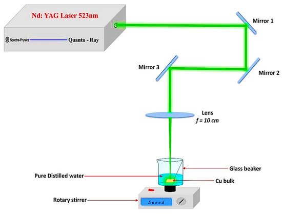 The pulsed laser ablation approach is thought to be the most effective, dependable, and economical method for synthesizing CuO NPs [22,27,28,29,30], in addition to being the best in terms of nanoparticle size distribution. The experimental setup employed in this investigation to synthesize CuO NPs is depicted in Figure 1. To produce the CuO NPs, Spectra Physics (Milpitas, CA, USA) supplied a Quanta-Ray PRO-Series 350-10 nanosecond 532-nm Nd: YAG laser source with a 10 Hz repetition rate, and a pulse duration of 10 ns was used. A square piece of bulk Cu sample with a purity of 99% was exposed to a pulsed laser beam while it was submerged in a glass beaker with 10 milliliters of pure distilled water to form CuO NPs colloids, where the average excitation power was fixed at 600 mW.