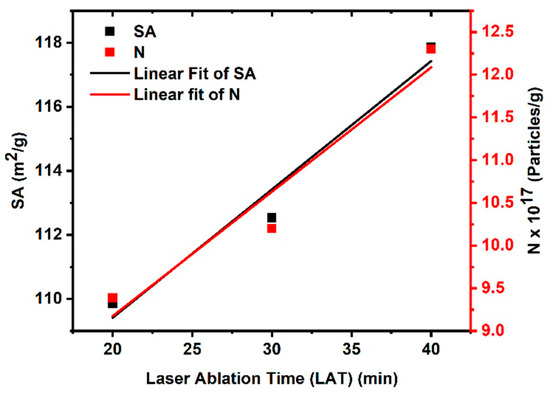 The volume-specific surface area (VSSA) method [35,36] can be used to compute the total surface area (SA) of the acquired samples using Equation (1), keeping in mind that the Cu density is (at room temperature). The extracted results are plotted in Figure 3, which shows that the total surface area increases with increasing LATs. This can be understood as the total number of CuO NPs increasing with increasing ablation time due to the fragmentation process. Additionally, the number of particles (N) at each gram is increased by increasing the LAT.