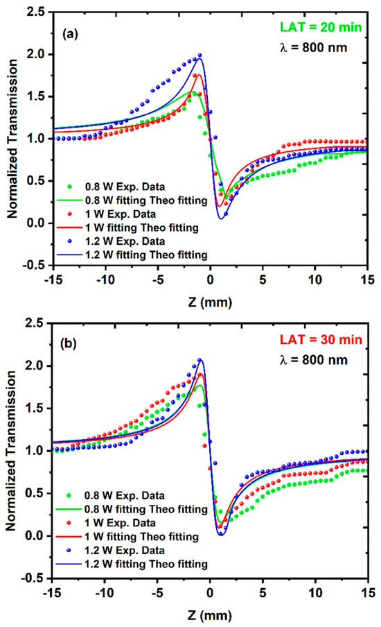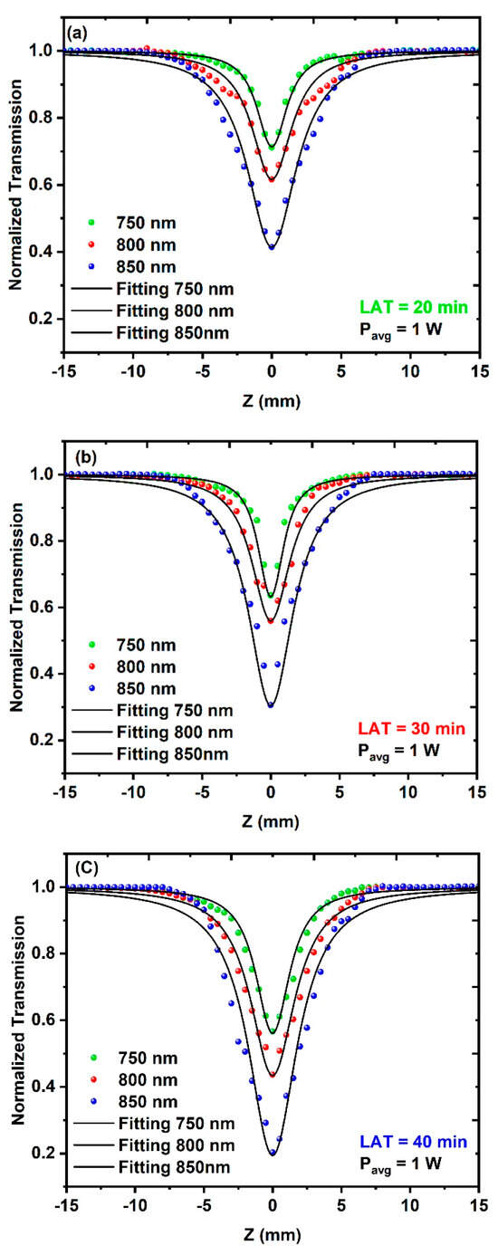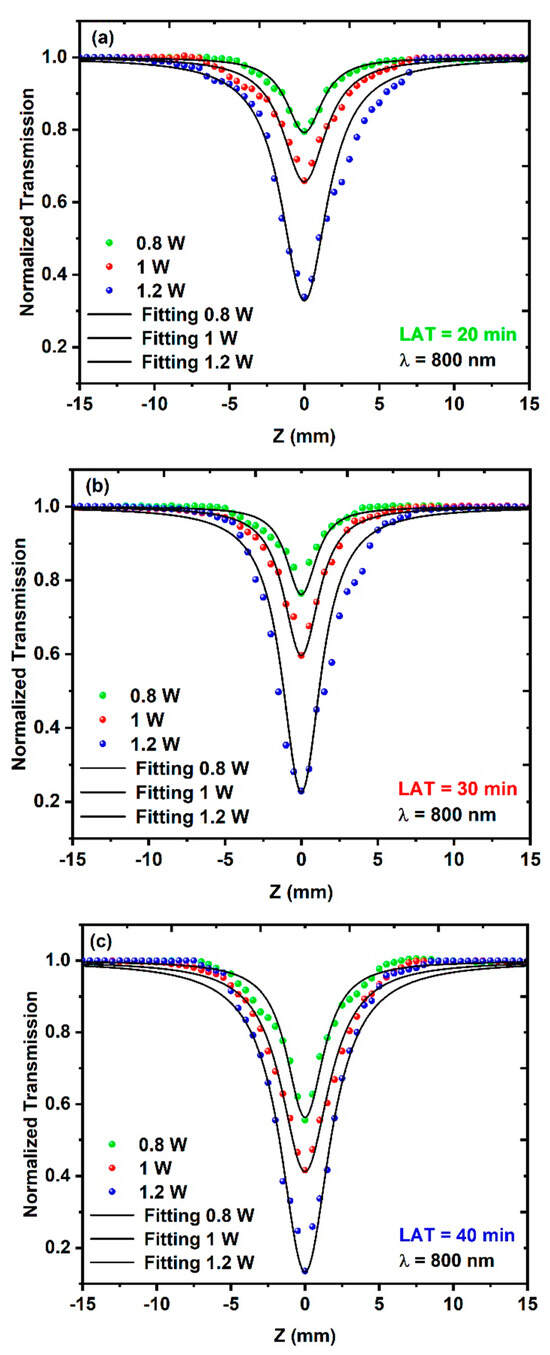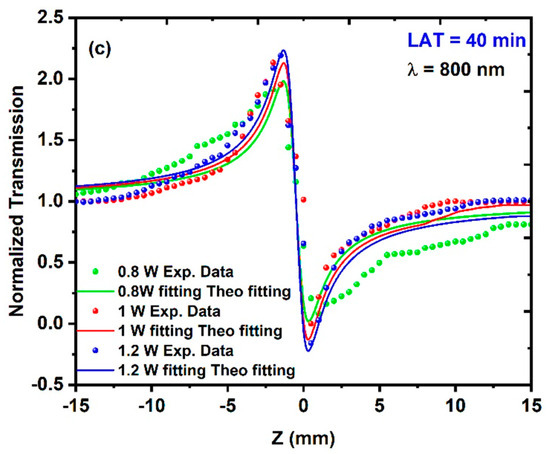 The dependence of the NLA coefficient on both the average excitation power and the excitation wavelength was examined during this study, where the different CuO NPs samples demonstrated a reliance on both the excitation wavelength and the average power. Figure 8a–c shows the experimental results of the open-aperture (OA) measurements for the three different CuO NPs samples. During these measurements, the samples were irradiated to different average powers of 0.8 W, 1 W, and 1.2 W at a constant excitation wavelength of 800 nm.
