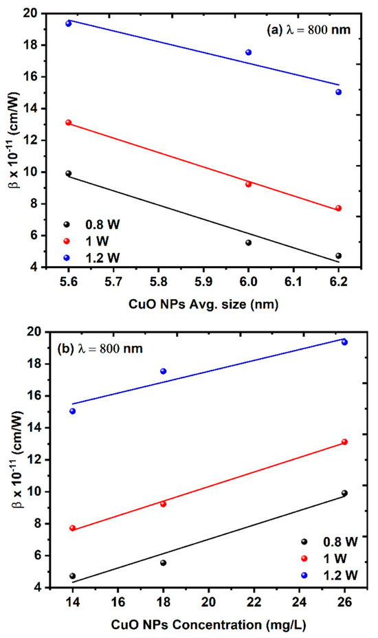 Effect of average power on the NLA coefficient at a constant excitation wavelength of 800 nm: (a) NLA coefficient as a function of average CuO NPs average size and (b) NLA coefficient as a function of the CuO NPs concentration.