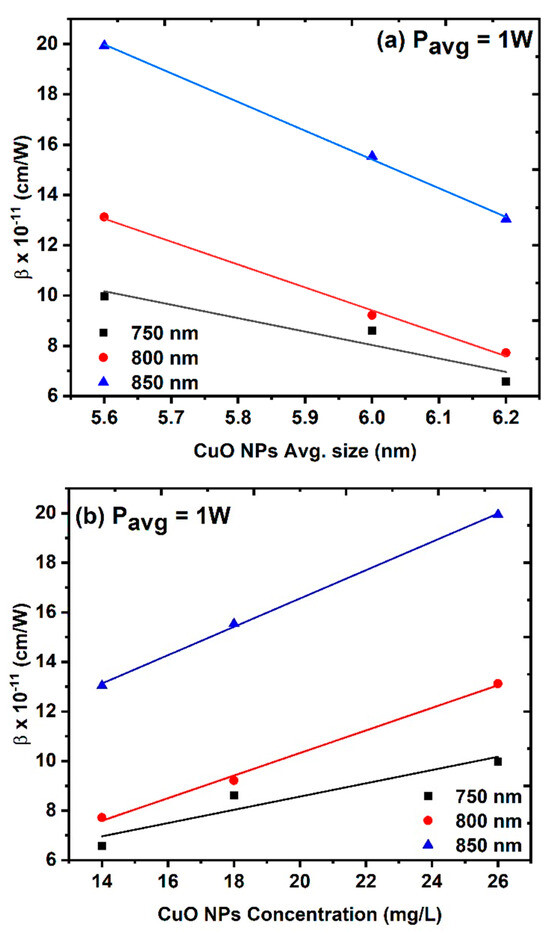 The effect of the excitation wavelength on the NLA coefficient at a constant average power of 1 W: (a) NLA coefficient as a function of the average size of CuO NPs and (b) NLA coefficient as a function of the CuO NPs concentration.