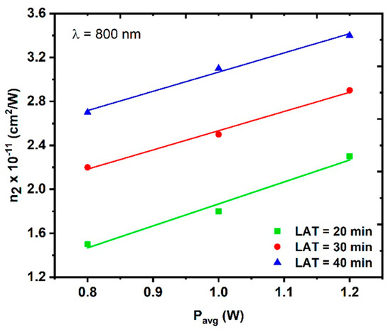 Figure 13 shows the variation in the NL refractive index (and thus ) as a function of the average laser power for different CuO NPs samples. The relationship between both and the average power is linear. For each sample, the nonlinear refractive index parameter () was calculated based on the slope of the fitting lines. This can be understood as follows: when the average power increases, more electrons exit and enhance the nonlinear response of the sample.