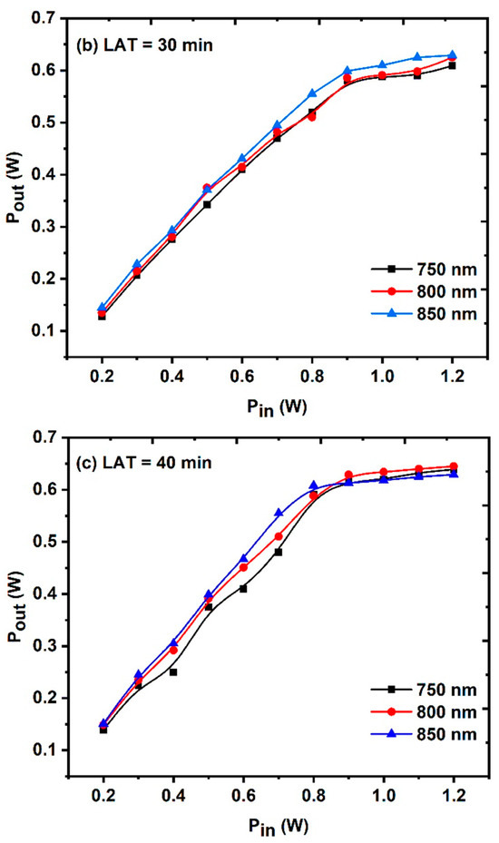 As an optical limiter (OL), the three synthesized samples at various LATs were evaluated. The samples were examined at various wavelengths between 750 and 850 nm, with the sample placed at the convex lens’s focal length and the input average power being scanned between 0.2 and 1.2 W. The samples exhibit the features of an efficient optical limiter. As the size of the CuO NPs decreased and the concentration of CuO NPs increased, as shown in Figure 15a–c, the sample behaved better as an optical limiter. This finding is consistent with the RSA values stated in Section 3.2.1, which reveal that samples with higher concentrations have greater NLA coefficient.