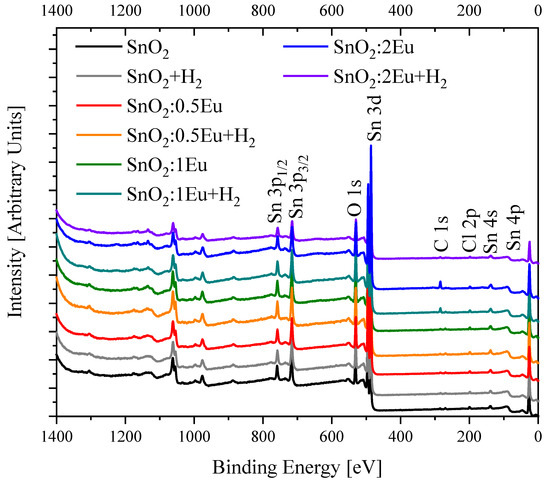 XPS Survey spectra presented in Figure 2 show signals only from Sn, O (lattice), Eu (dopant), and C (adventitious carbon). Also, we note a weak Cl 2p peak that arises from the SnCl4 precursor. Surface atomic concentrations calculated from the XPS Survey are presented in Table 2. It could be seen from Figure 2 and Table 2 that doping and annealing lead to a small decrease in the O/Sn ratio. It could be induced by the rising number of oxygen vacancies due to substitution of Sn4+ by Eu3+ or Eu2+ and annealing in oxygen-deficient atmosphere.