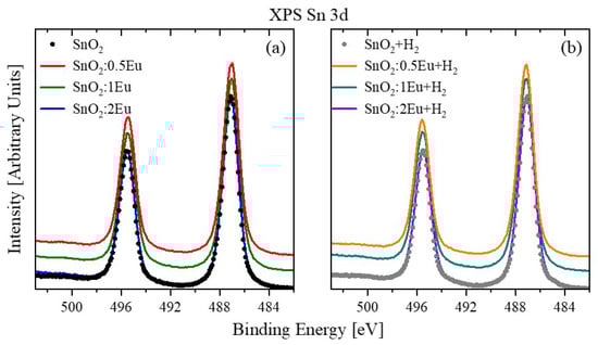 XPS Sn 3d spectra of SnO2:xEu (a) and SnO2:xEu + H2 (b) samples.