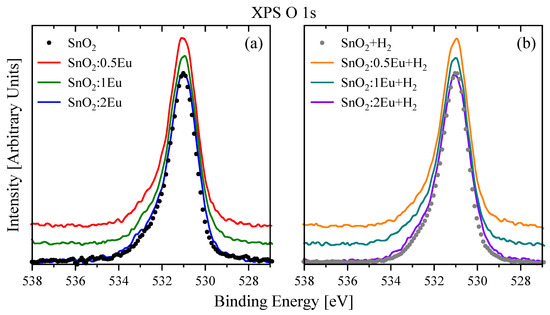 XPS O 1s spectra of SnO2:xEu (a) and SnO2:xEu + H2 (b) samples.