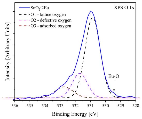 Taking into account the arguments discussed above regarding the defects and distortions of the oxygen lattice, it is important to consider the high-resolution O 1s spectra (Figure 4). The spectra of all samples show a non-elementary shape with broadening in the high binding energies region. The main peak is located in the region of 531.02 eV and is in good agreement with the energy position for the O–Sn bond in SnO2 [30,31]. At the same time, the appearance of “defective” non-lattice oxygen is known for several oxides [31,32,33]. The signal from these oxygen atoms is located between the peaks of lattice and adsorbed oxygen. Moreover, in Ref. [33], the appearance of a defective peak in SnO2 is associated with the formation of [SnO6] octahedra. At the same time, in our work, unlike Ref. [33], we do not see noticeable shifts in the Sn 3d spectra. Therefore, there is no reason to talk about the formation of [SnO6] octahedra. Nevertheless, adhering to the concept of “defective” oxygen, we also deconvoluted O 1s spectra into three peaks: lattice oxygen—O1 (530.8 eV), “defective” oxygen—O2 (531.7 eV) and adsorbed oxygen—O3 (532.8 eV). An example of such a fitting is shown in Figure 5, and the peak area ratio is summarized in Table 3. On the one hand, annealing in hydrogen leads only to a slight increase in defective oxygen, which may be associated with the formation of oxygen non-stoichiometry and manifests itself in the Sn 3d spectra. On the other hand, the introduction of europium leads to a noticeable decrease in the content of defective oxygen, which is apparently due to the formation of Eu–O bonds (529 eV [34]), which cause a redistribution of the oxygen environment near tin due to the difference in the valence of tin (4+) from europium (2+ or 3+). Thus, europium can locate in the area near “defective” oxygen and lead to a change in O2 peak intensity due to an increasing of the O1 component, to which the Eu–O bond will contribute. In addition, in Ref. [31], it was suggested that oxygen is caused by surface O2− ions from the SnO2 lattice, oxygen vacancy, interstitial oxygen, or oxygen antisite in the oxygen-deficient regions, which is consistent with the possible influence of europium on such areas. We emphasize that the annealing of the SnO2:2Eu sample leads to a decrease in the O2 peak, which is apparently due to the appearance of the secondary Eu2O3 phase with the formation of a larger number of Eu–O bonds.