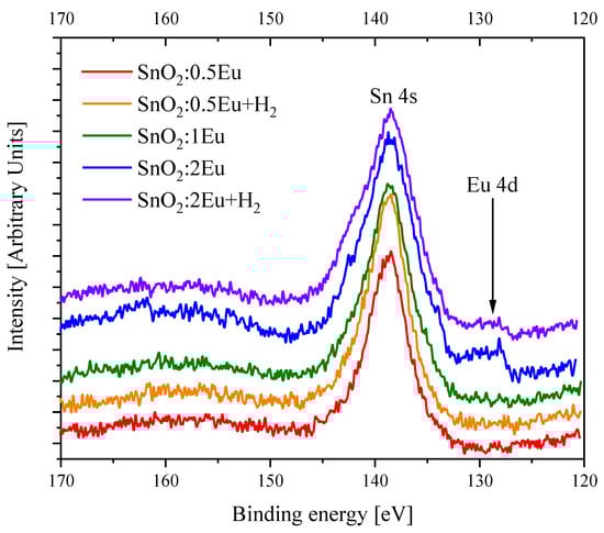 The XPS spectra of Eu 4d and Eu 3d are shown in Figure 6 and Figure 7, respectively. Note that the Eu 4d peak strongly overlapped with the signal from the Sn 4s level, which does not allow one to draw conclusions about the presence of Eu3+. However, even in such a situation, it is seen that the introduction of 2 mol.% europium leads to the appearance of a low-energy feature in the region of 128 eV, which corresponds to the appearance of Eu2+ [34,35]. Note that annealing leads to a decrease in the relative intensity of the Eu2+ signal in the XPS Eu 4d spectra.