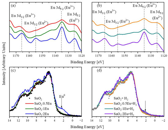 XPS Eu 3d (a,b) and valence band (c,d) spectra of SnO2:xEu (a,c) and SnO2:xEu + H2 (b,d) samples.